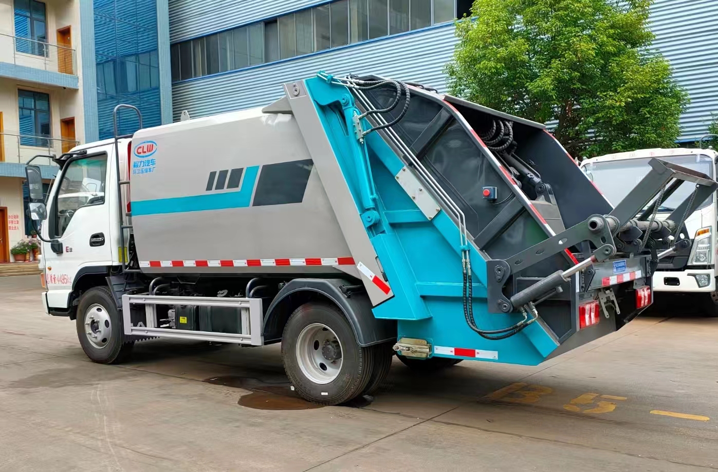 上裝配置 箱體5.8方容積,優質高強度板材制作,圓弧形箱體結構,外置滑板油缸,箱體厚度邊3底4,帶尾部側部雙污水箱,光電感應,博利油缸,英國DLI密封圈,威森博樂多路閥,安徽皖液油泵,CAN/PLC操作模式,帶駕駛室操作,標配無線遙控器,標配壓實閥,增加裝載量。