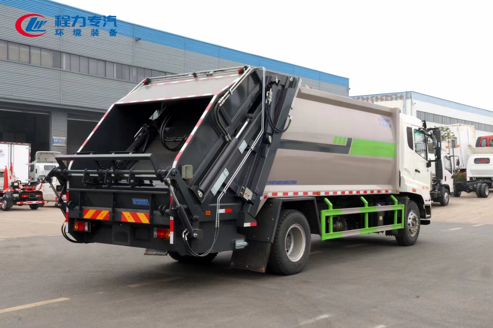 上裝配置 上裝為弧形箱體結構,采用Q345(局部采用T710)高強度板制作。有效容積15-18立方,采用中梅大通徑五聯手氣一體多路閥,全系標配背壓閥(增加雙向壓縮比),合資鐵殼液壓齒輪泵,嘉善取力器,中梅手氣一體多路閥,恒力油缸(質保兩年),加強型掛捅后翻轉機構(可選裝三角斗、全密封斗、擺臂等翻轉機構),外置滑板缸結構設計,石墨烯尼龍滑塊,長沙福力CAN總線控制系統,尾部帶有硅膠控制面板,標配無線遙控,帶光電感應保護裝置,標配后污水箱,(中聯樣式雙排污口),可加裝側邊污水箱。加裝氣動密封蓋。
