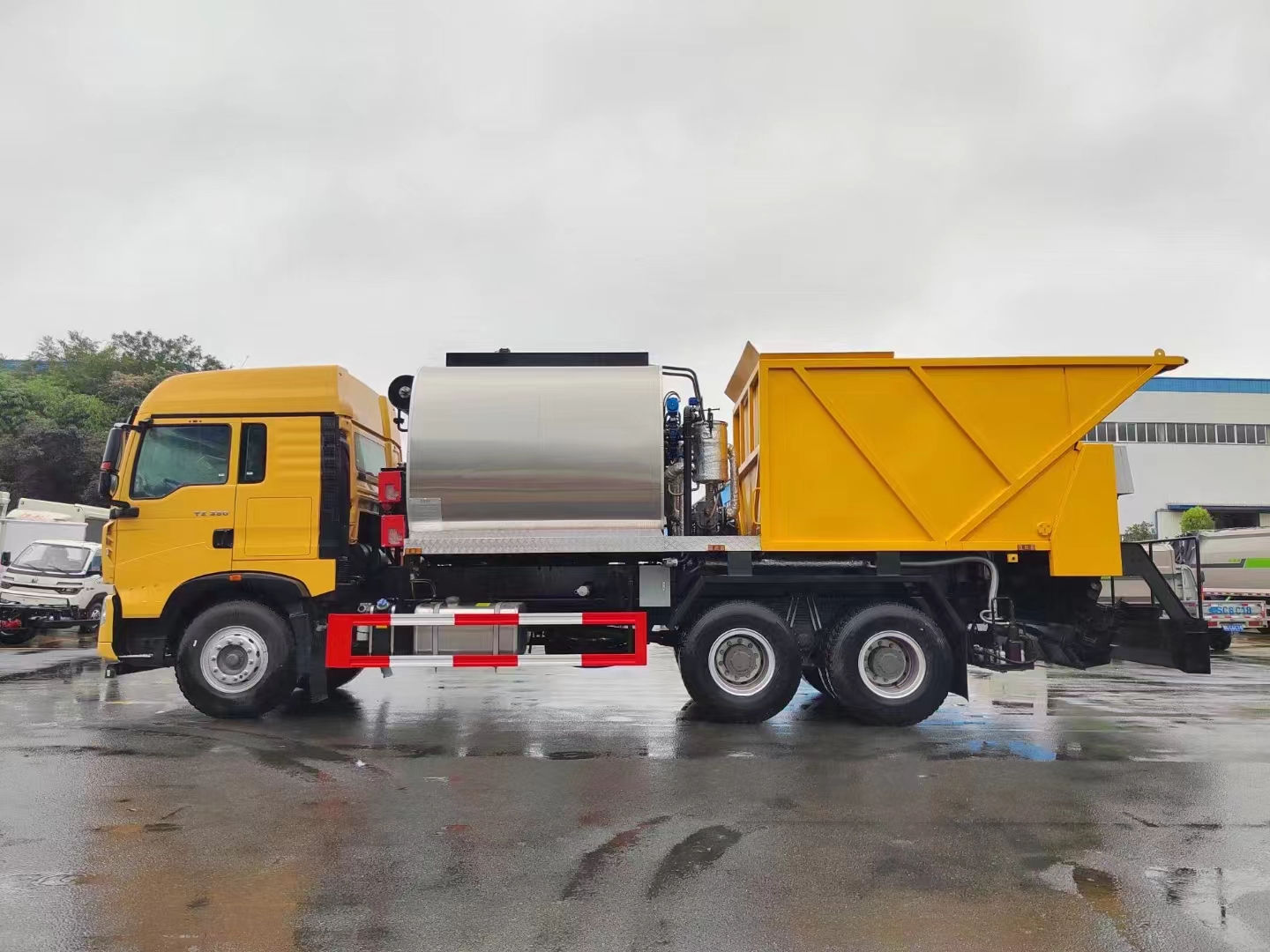 設備優點 獨家采用全液壓驅動模式,不需要添加任何輔助動力使操作更加簡單方便。獨家采用高效的導熱油鍋爐升溫,使溫升速度大大的得到提升,打破了傳統的煙道加溫方式。該設備采用內舉升料斗就可實現石屑撒布施工,更方便涵洞施工、橋下施工、以及彎道施工;該設備完全采用電氣控制,自動化程度高,能精確的計算出設備在施工過程中瀝青噴灑量和石屑撒布量的多少;料門控制采用角度儀,保證設備下料的精度;降低了施工的勞動強度,節約了人力資源,降低施工成本,提高工作效率、工作質量;整機運行穩定,撒布均勻,可自由調節灑瀝青撒料寬度;良好的保溫層確保保溫性能指數≤20℃/8h,且防腐耐用;可以噴灑各種瀝青介質,撒布從S3~S24mm的石料;設備采用加工精確度高的噴嘴,使每個噴嘴噴灑一致性和噴灑效果得到充分保證;整體操作更具人性化,具有遠程控制,也有現場操作,給操作者帶來了很大的便利;通過電氣控制與液壓系統恒壓裝置的完美結合,實現了零起步噴灑;整機經過多次的工程施工改進,工作性能可靠,操作維護方便,性價比高。