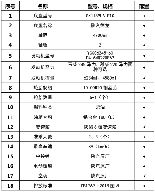 1,僅采用軸距4700mm; 2、該車(chē)廣泛應(yīng)用于修筑高等級(jí)公路瀝青路面灑布作業(yè),主要專(zhuān)用裝置瀝青罐體,瀝青噴灑系統(tǒng),罐體總?cè)萘?9.5立方米, 有效容積:9.06立方米,罐體外形尺寸(長(zhǎng)×長(zhǎng)軸×短軸)(mm):4150×2450×1700,介質(zhì):液態(tài)瀝青,密度:900千克/立方米;罐體保溫層厚度為80mm;3、側(cè)防護(hù)材料采用Q235,焊接連接;后防護(hù)由專(zhuān)用裝置代替,下邊緣離地高480mm;4、ABS系統(tǒng)生產(chǎn)廠家:西安正昌電子股份有限公司,型號(hào):ZQFB-V. 后部照明燈僅在駐車(chē)狀態(tài)下使用,起夜間照明作用,行駛過(guò)程中不可點(diǎn)亮。隨底盤(pán)選裝駕駛室。選裝排氣管樣式。