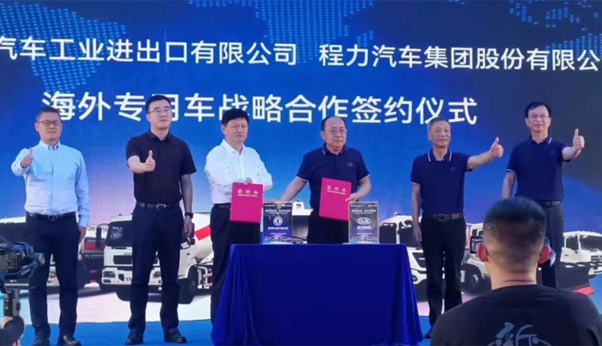 在這次線下大型東風商用車海外市場新產品推薦會上,中國東風汽車工業進出口有限公司與程力汽車集團股份有限公司聯合舉行了海外專用車戰略合作簽約儀式,雙方高層領導簽約后合影紀念。