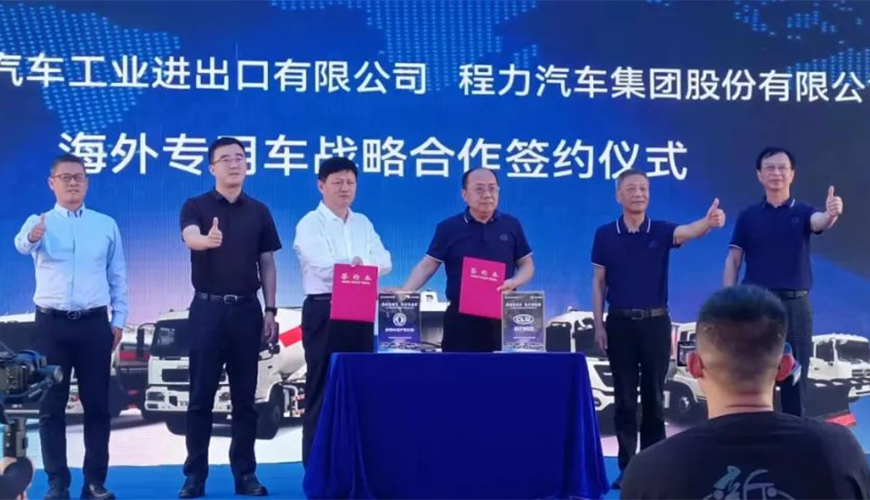 在這次線下大型東風商用車海外市場新產(chǎn)品推薦會上,中國東風汽車工業(yè)進出口有限公司與程力汽車集團股份有限公司聯(lián)合舉行了海外專用車戰(zhàn)略合作簽約儀式,雙方高層領導簽約后合影紀念。