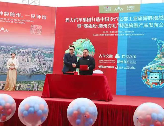 在程力工業旅游產品發布會上,程力汽車集團總經理程阿羅(左)與鄂旅投總經理王濤,簽署了文化旅游戰略合作框架協議,雙方決定利用各自的優勢強強聯合,共同開發工業旅游潛在市場,為隨州的經濟發展增添新的動能。