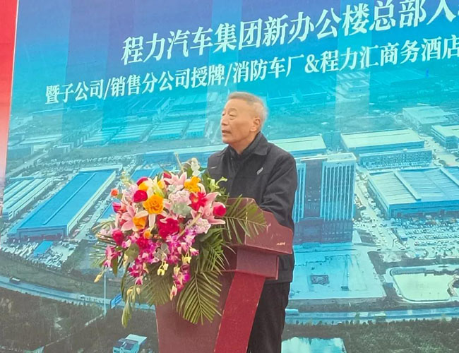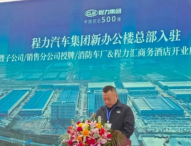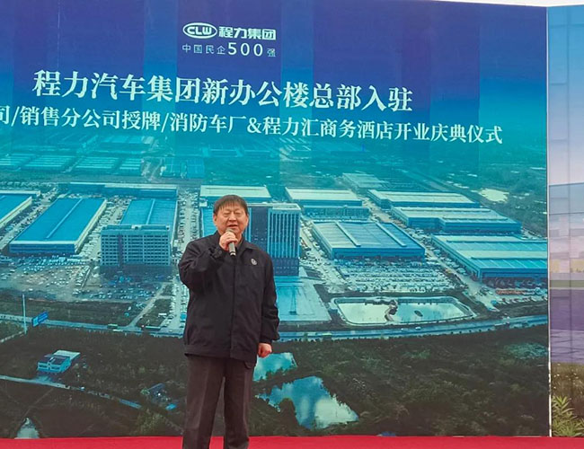 在程力集團新廠辦公大樓總部入駐慶典會上,集團總經理程阿羅為程力消防車公司總經理汪東洋,舉行了消防器材廠開業授牌儀式,汪東洋總經理作了表態和發言。