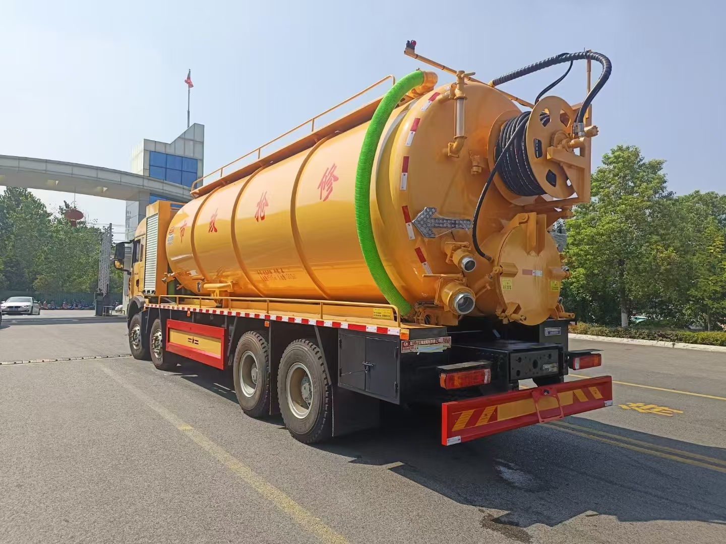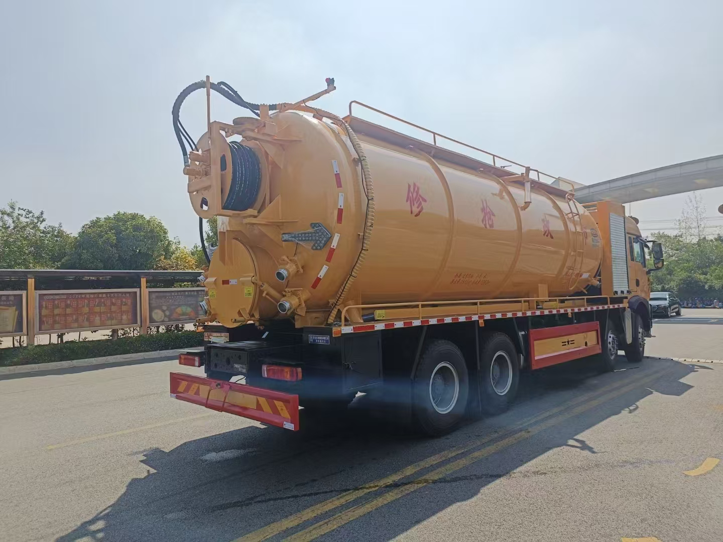 上裝配置 罐體總?cè)莘e約33立方,清水箱約10立方,其余為污水罐,加強(qiáng)大架,兩倉互通,采用8mm碳鋼制作,吸污部分,副發(fā)采用420馬力配258水循環(huán)泵,8米吸污管,罐體兩側(cè)加寬平臺(tái)加護(hù)欄,后部開一個(gè)600mm液壓開啟排污口,一個(gè)150排污球閥,和一個(gè)100的排污球閥,100內(nèi)抽球閥,后部左右各一個(gè)箭頭燈,配品浮350流量,配100米內(nèi)徑25定制耐磨高壓管,帶卷盤,卷盤液壓左右旋轉(zhuǎn)。