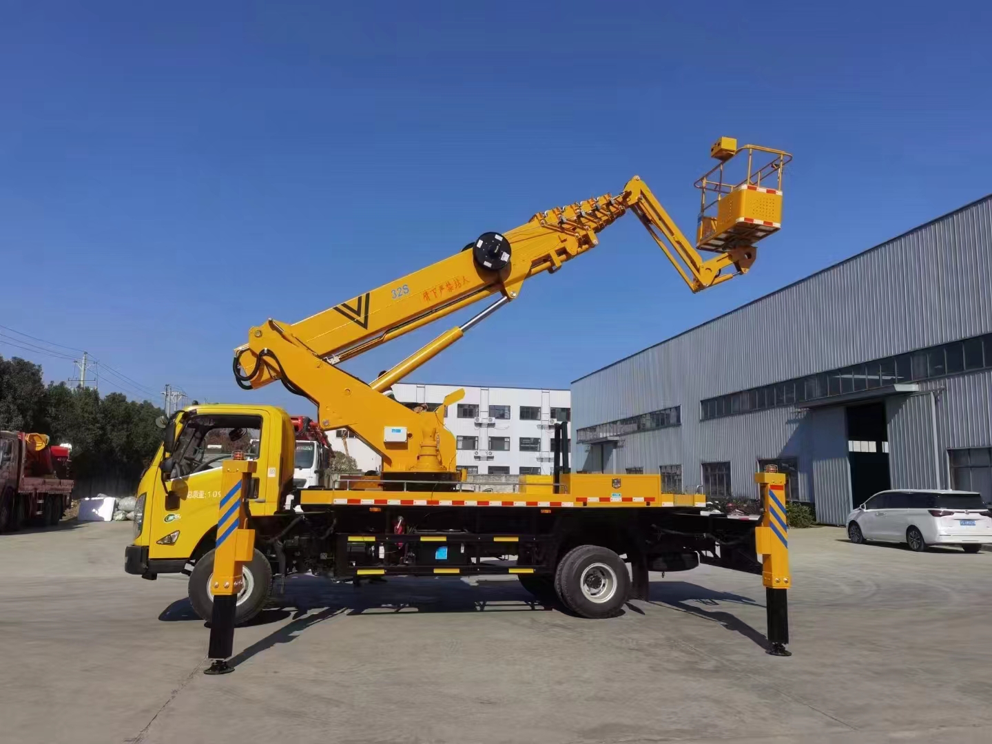 上裝配置 作業高度32米,帶小飛臂,六節六邊形同步伸縮工作臂,360度連續回轉,配上下車自動互鎖裝置,水平檢測功能,支腿檢測功能,裝有應急電動泵,電液比例控制系統,實現無極調速,液壓自動調平。